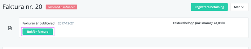 När fakturan är satt till periodiserad kommer en knapp Bokför faktura upp på fakturadatum i historiken. Klicka på den för att bokföra försäljningen som en kundfordring på fakturadatum. När fakturan sedan blir betald i nästkommande räkenskapsår går du in som vanligt och registrerar och bokför betalningen.