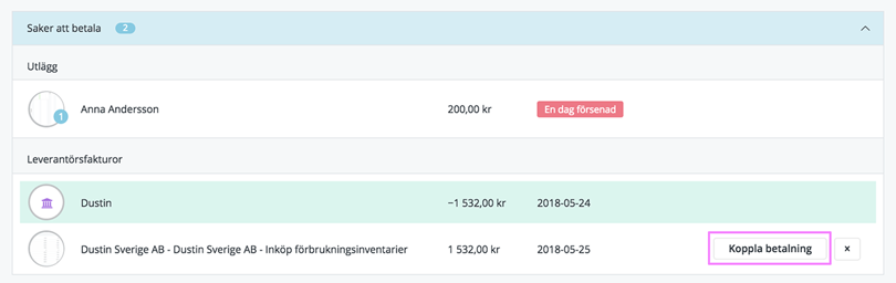 Välj den faktura som matchar betalningen bland dina uppladdade underlag.