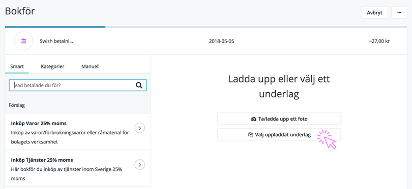 Matchar importerad bankrad inget underlag eller verifikat kan du nu direkt själv göra en matchning. Klicka upp bankraden. Därefter får du valet att ta eller ladda upp ett foto samt ladda upp PDF. Utöver detta finns även "Välj uppladdat underlag". Här kan du direkt välja bland de underlag som är uppladdade i Bokio och som ännu inte har bokförts.