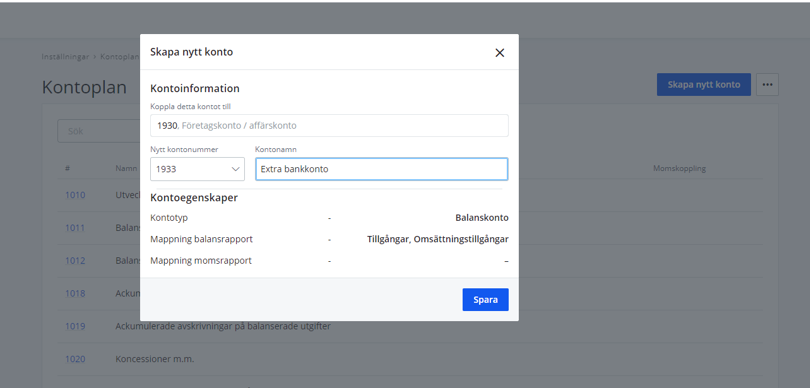 För att komma åt att lägga till egna konton så går du till Inställningar → Kontoplan. För att lägga till ett bokföringskonto, klicka på Skapa nytt konto. Vill du lägga till ett nytt bankkonto så fyller du i numret på bokföringskontot och väljer att koppla det till exempelvis 1930. Du kommer direkt kunna se vart kontot kommer att hamna i de olika rapporterna.