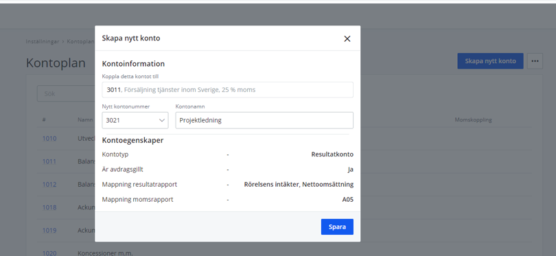 En förutsättning för att kunna lägga till ett eget bokföringskonto är att du också måste se till att koppla det egna kontot till ett existerande konto som finns i basplanen. Vi använder det kopplade kontot för att avgöra var det du har bokfört på det nya kontot ska hamna i olika rapporter, såsom resultat- och balansrapporten exempelvis.