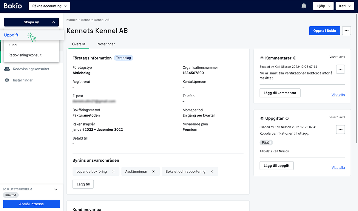 För att du ska slippa gå i olika flikar kan du nu utföra fler saker direkt från huvudmenyn. Här kan du numera skapa nya uppgifter, lägga till kunder och redovisningskonsulter.