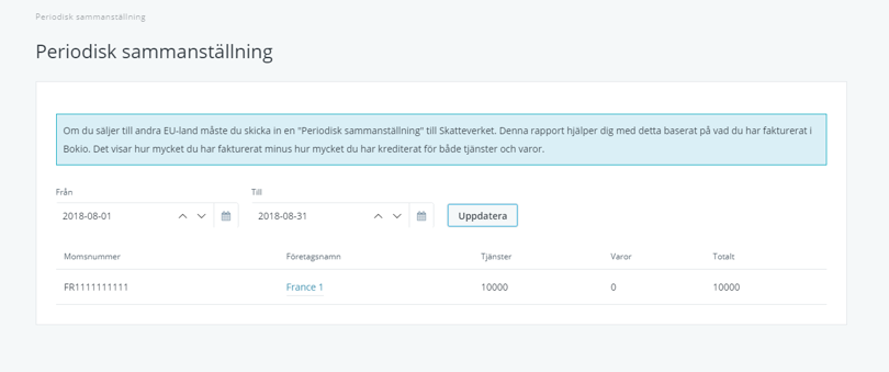 I senaste uppdateringen har alla användare fått den nya versionen av sidan Bokfört. Den finns nu även en funktion för periodisk sammanställning. Detta ska redovisas till Skatteverket av företag som fakturerar kunder inom EU.