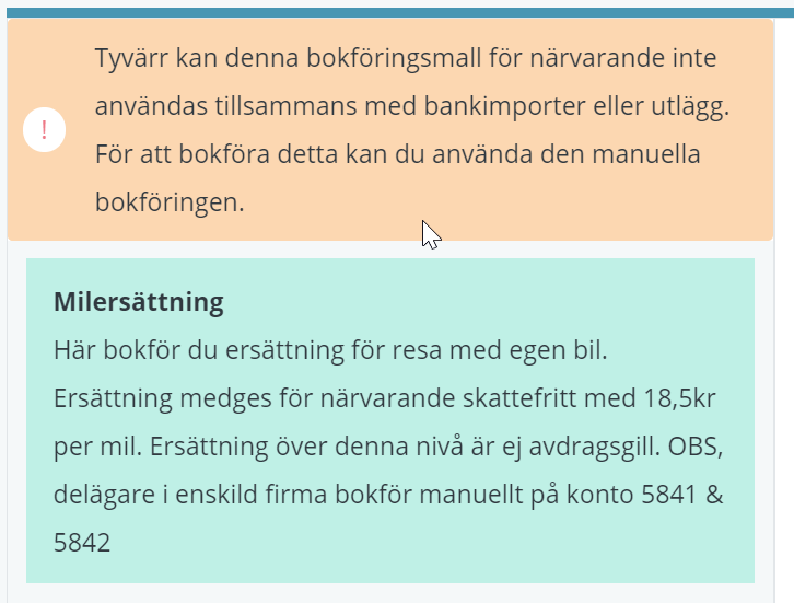 - Milersättning och ett par andra bokföringsmallar har inte kunnat användas korrekt tillsammans med bankimporter och utlägg. För att förhindra att fel uppstår har vi för tillfället blockerat dessa mallar när man bokför en bankimport eller ett utlägg. En tillfällig workaround är att använda den manuella bokföringen. För bank importer kan man också först skapa verifikatet för t.ex. Milersättning som en vanlig kostnad och därefter associera det verifikatet med den importerade bank raden.