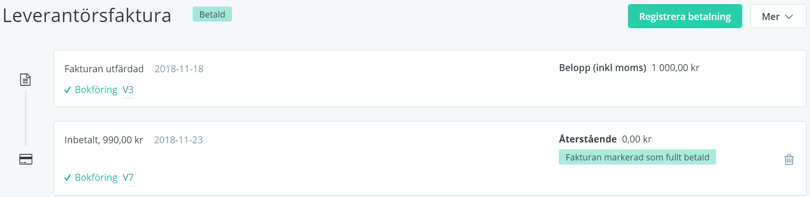- Nu syns det tydligare på leverantörsfakturor som markerats som betalda (även om summan inte stämmer helt med inbetalt belopp).