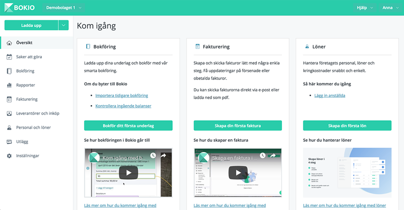 - Ny "Kom igång"-guide. Vi presenterar Bokios funktioner för bokföring, fakturering och löner ett bättre sätt inne i systemet och du har direkt tillgång till både filmer och guider som kan vara bra att se när man börjar använda Bokio.