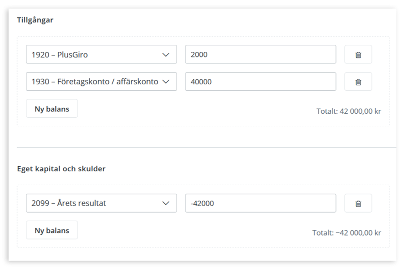 Om du börjar använda Bokio vid ett räkenskapsår som inte är det första för verksamheten måste du mata in första årets ingående balanser. Med andra ord, hur mycket pengar som fanns på varje balanskonto vid starten av räkenskapsåret.