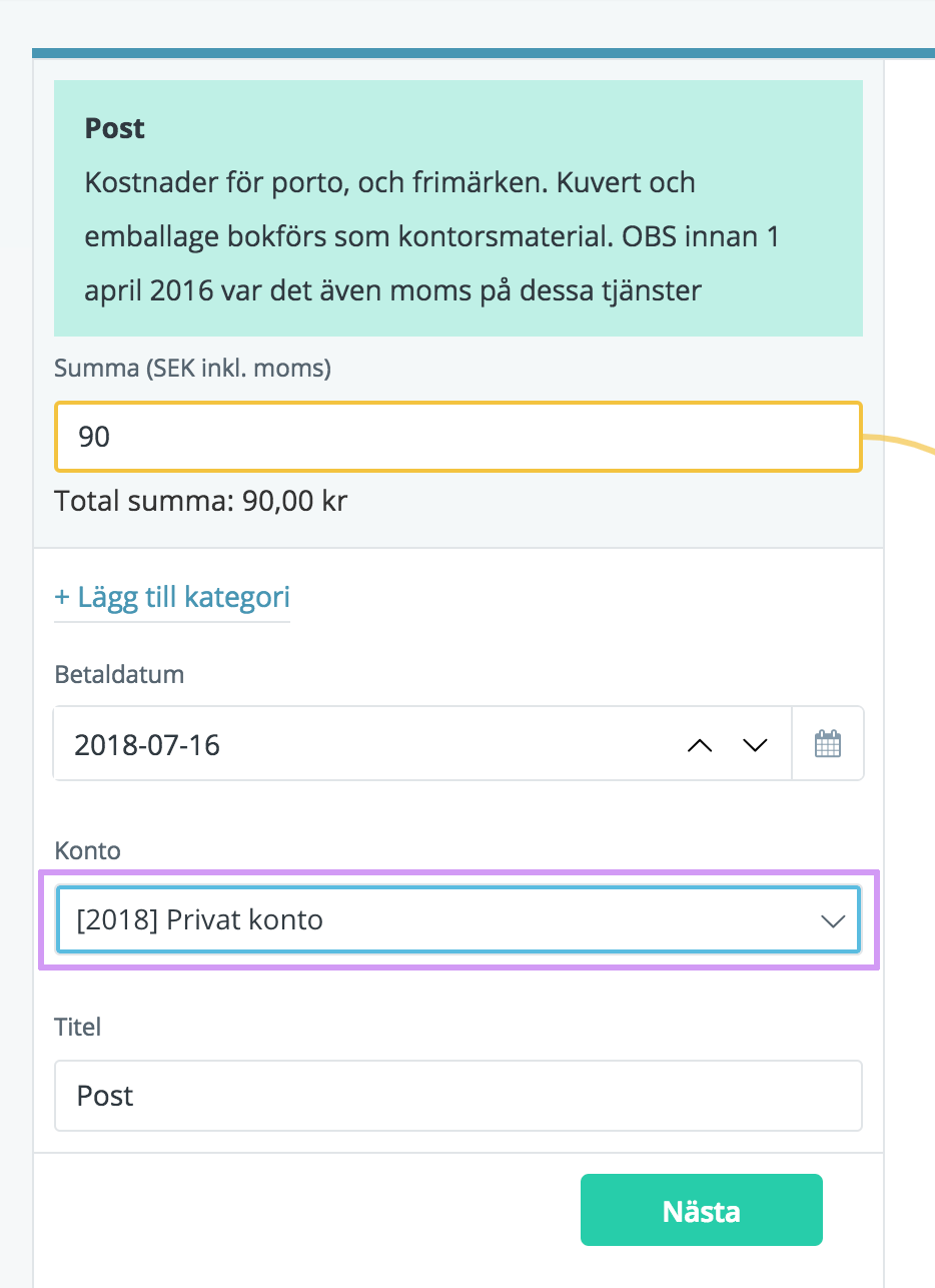 Har du köpt något med privata medel (det spelar ingen roll om du betalat det kontant, med kontokort, kreditkort, Swish mm ) som hör till verksamheten så betyder det att företaget har en skuld till dig. När inköpet ska bokföras så hanteras det som vilket inköp som helst. Skillnaden är betalkontot du använder. I Bokio rekommenderar vi att välja skuldkonto 2018 (Övriga egna insättningar) som betalkonto. Detsamma gäller om du säljer något och får inbetalt till ditt privata bankkonto eller skulle ta kontanterna till din privata "plånbok".