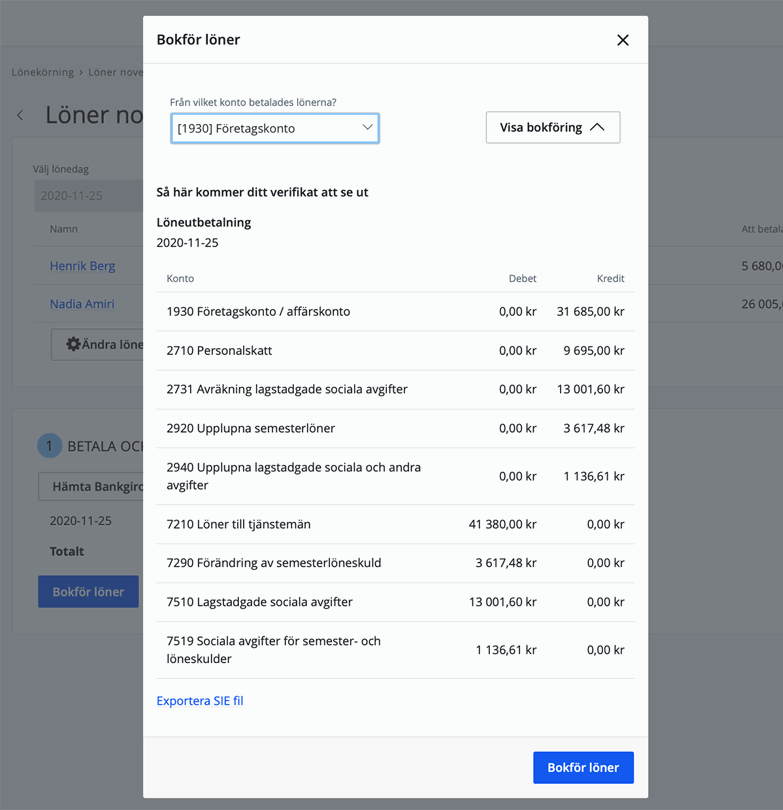 När du har skickat lönebesked till dina anställda är det dags att betala och bokföra. Har du valt att använda Bokio Företagskonto så sker båda steg automatiskt efter det att du signerat betalningen. Om du väljer manuell banktransaktion så får du själv se till att lönen blir betald på lönedagen och sedan klicka på att bokföra.. Du slipper själv hålla koll på vilka summor som ska hamna på vilket bokföringskonto.