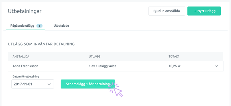 Som administratör för utlägg kan du under "Utbetalningar" schemalägga när det är dags att betala ut till den anställde för utlägget.