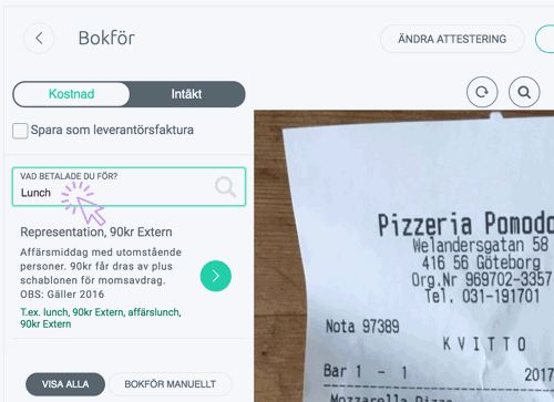 Använd Bokios moderna bokföring för att bokföra utlägget. Den som laddat upp kvittot har redan fyllt i information som datum och summa vilket då ej behöver hanteras när det bokförs. Stämmer inte uppgifterna kan administratören ändra attestering och neka utlägget.