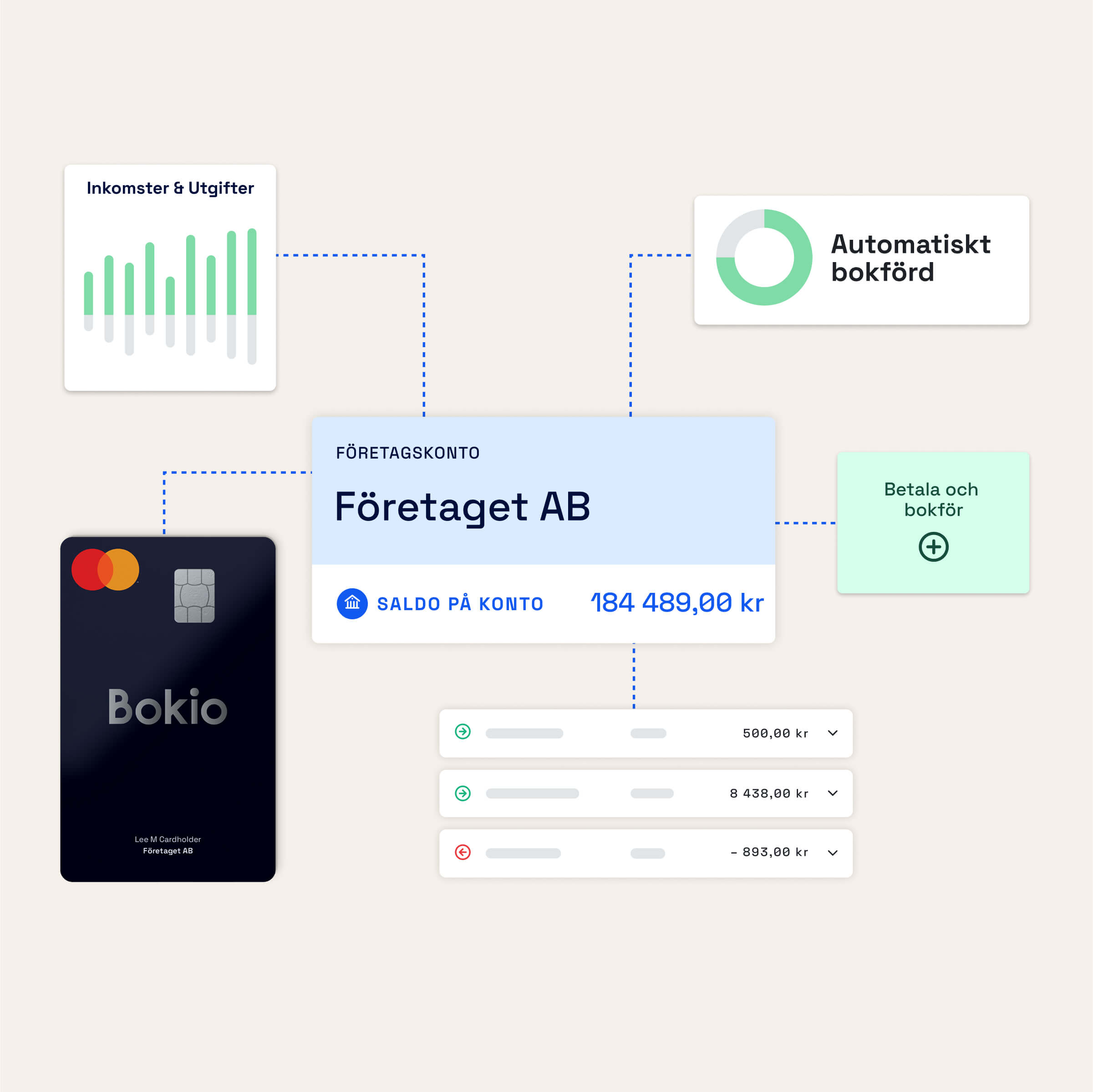 Bokio Företagskonto är ett företagskonto med bankkonto, bankgiro och företagskort som du enkelt ansöker om direkt i Bokio. Till skillnad från att koppla en extern bank till din bokföring är Bokio Företagskonto helt integrerat – alla betalningar och transaktioner hanteras automatiskt på samma plats som din bokföring. När du öppnar ditt företagskonto kan du välja att inkludera bankgiro och även flytta över ett befintligt bankgironummer.
