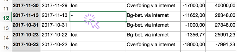 Logga in på din internetbank och kopiera de rader du vill importera till Bokio. Ctrl+C på PC och ⌘+C på Mac. För att rader och kolumner ska kunna läsas av i Bokio kan det ibland krävas att man först klistrar in utdraget i tex Excel för att justera och rätta till tabellen. Att kopiera direkt från en PDF-fil brukar vara svårt för systemet att läsa av. Tänk på följande: