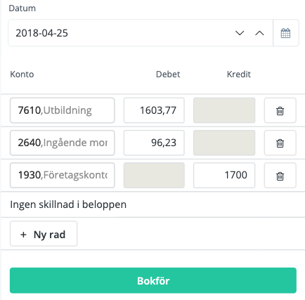 När samtliga konton är tillagda och det balanserar mellan debet och kredit kan du bokföra. Vill du lägga till ytterligare bokföringskonton så klickar du på Ny rad.