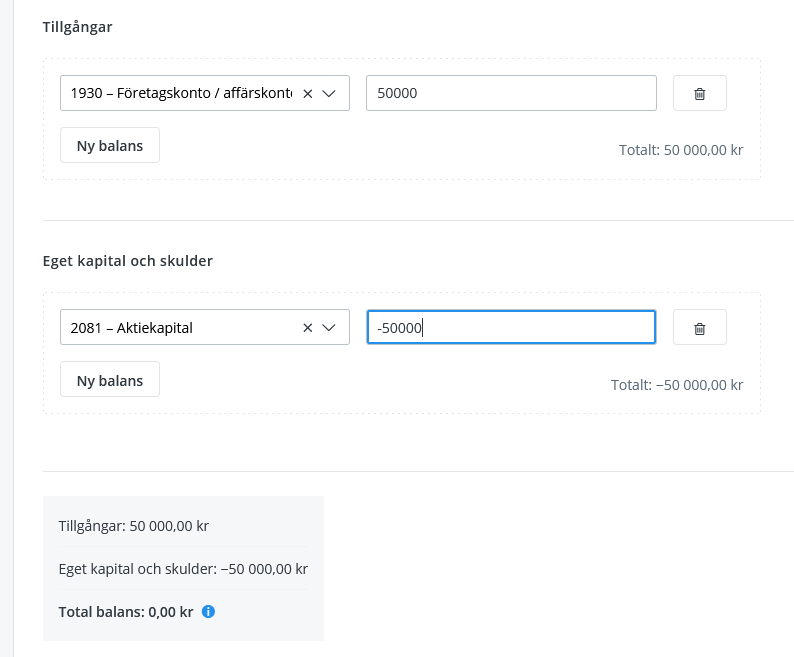 Importerar du inte tidigare bokföring måste du se till att föra in ingående balanser manuellt. Det gör du under Inställningar → Ingående balanser. Där anger du följande värden förutsatt att pengarna är på ditt företagskonto. Samtliga konton i klass 1 och 2 (balanskonton) som ligger som utgående balans från föregående räkenskapsår ska vara med i ingående balanser. Klicka sedan på Spara.