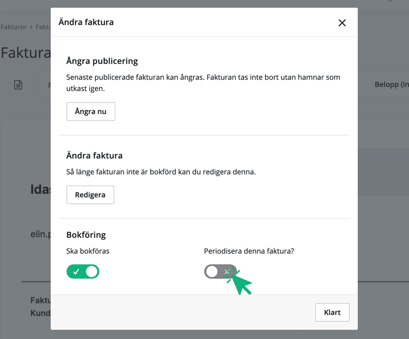 Om du använder kontantmetoden måste aktuella fakturor inom EU utan moms bokföras enligt fakturametoden för att periodiska sammanställningen ska bli korrekt. Du kan bokföra en faktura enligt fakturametoden genom att klicka på flervalsikonen (...) i högra hörnet på en publicerad faktura. Klicka på Ändra faktura → Periodisera denna faktura.