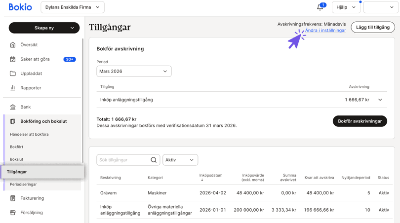 I Bokios anläggningsregister kan du välja om dina tillgångar ska skrivas av månadsvis eller årligen. Inställningen omfattar hela anläggningsregistret och tillämpas automatiskt på samtliga avskrivningsbara tillgångar.