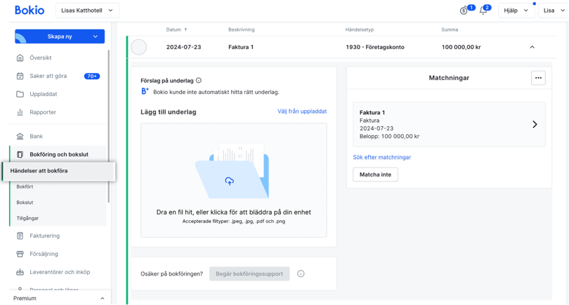 För att förenkla och säkerställa korrekt bokföring rekommenderar vi att du alltid hanterar dina banktransaktioner via funktionen Bokföring och bokslut → Händelser att bokföra. På så sätt säkerställer du att bokföringskonto, belopp och datum stämmer. Du får dessutom nytta av Bokios automatiska bokföringsförslag, bokföringsregler och smarta bokföringsmallar.