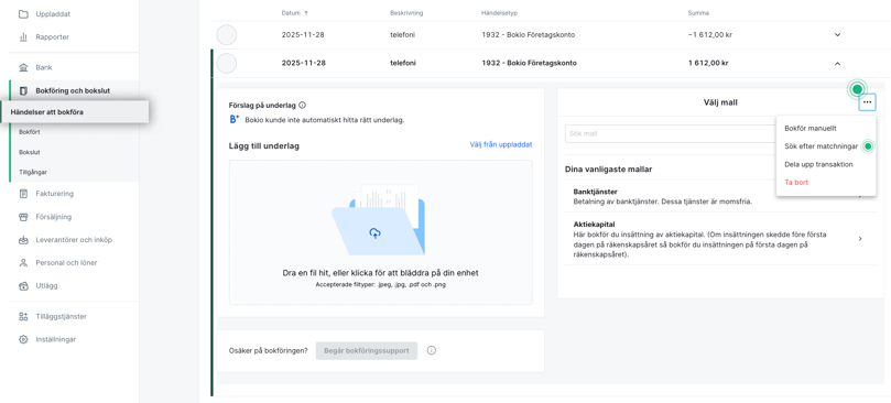 - Gå till Händelser att bokföra, välj återbetalningen och klicka på (…) → Bokför manuellt.