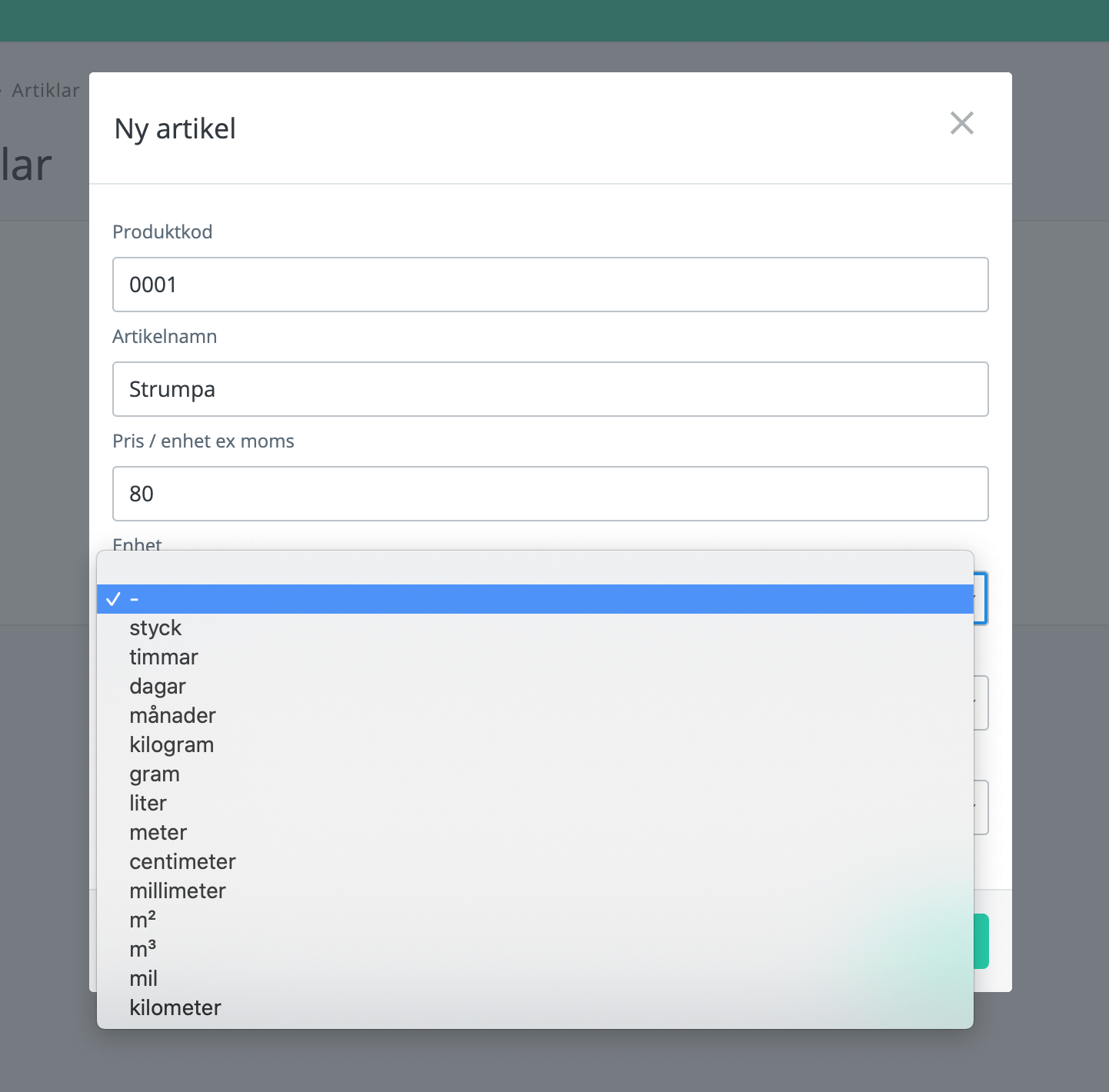 Du kan också välja vilken enhet varan eller tjänsten ska ha.