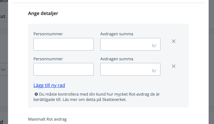 När det kommer till att fakturera rot/rut-tjänster så kan vi enbart göra detta till privatpersoner. Om du vill kombinera rot- eller rut-avdrag från flera personer så är det bara att klicka på Lägg till ny rad under Aktivera Rot/Rut knappen.
