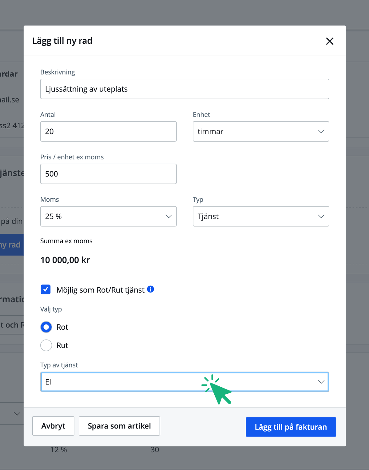 Lägg till en beskrivning om de avdragsgilla tjänsterna som utförts och mellan vilka datum arbetet har utförts. Kontrollera alltid att samtliga artiklar stämmer innan du aktiverar avdraget på fakturan. Läs mer hos Skatteverket hur en rot/rut faktura ska vara utformad.