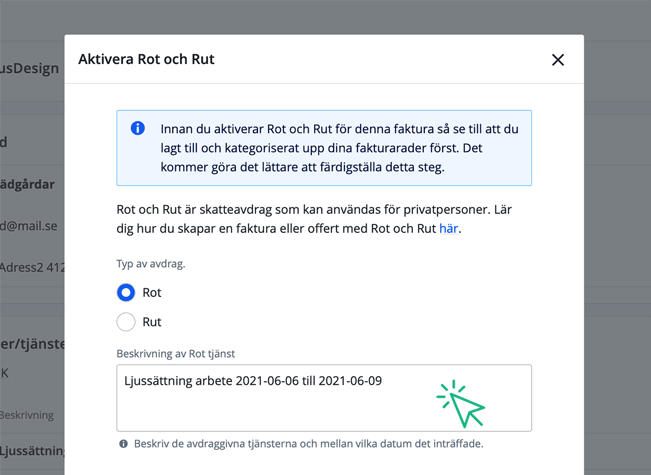 Lägg till en beskrivning om de avdragsgilla tjänsterna som utförts och mellan vilka datum arbetet har utförts. Kontrollera alltid att samtliga artiklar stämmer innan du aktiverar avdraget på fakturan. Läs mer hos Skatteverket hur en rot/rut faktura ska vara utformad.