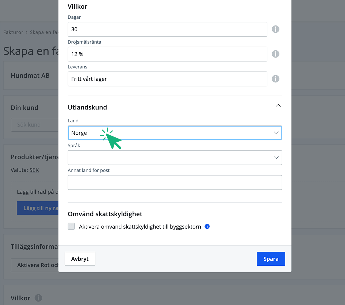På kundens inställningar under Villkor & utlandskund ska du välja vilket land kunden är ifrån. Ställer du ej in att kunden är från utlandet kommer den automatiska bokföringen av fakturan att bli felaktig.