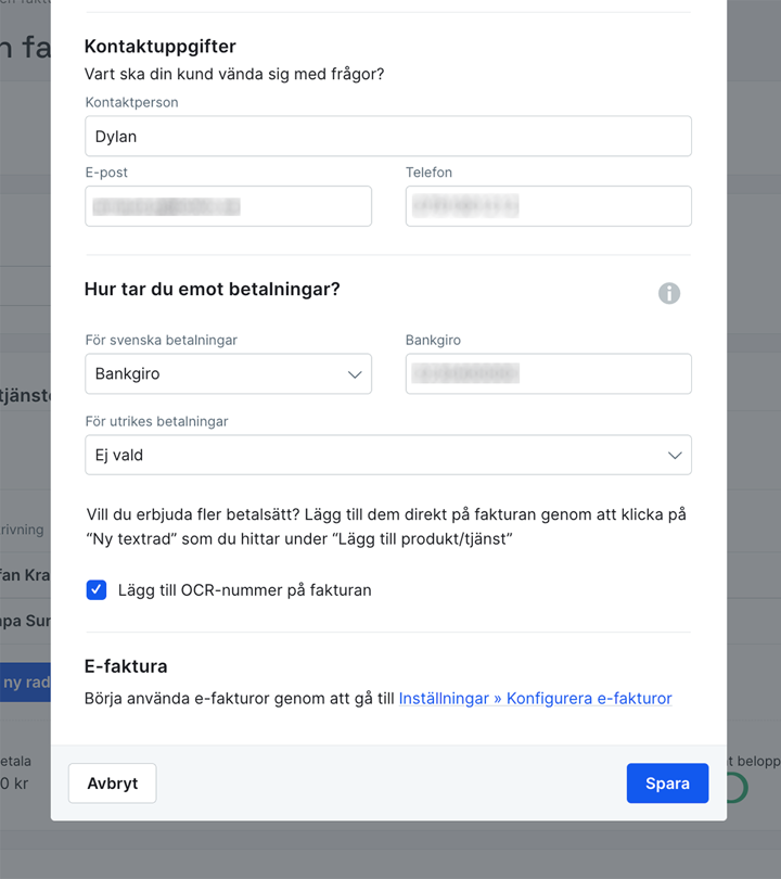 Väljer du att fylla i både inrikes och utrikes så kommer inrikesbetalningen redovisas på fakturan om det är en svensk kund, medan utrikesbetalningen kommer redovisas på fakturan om kunden du valt är från utlandet. Detta justeras alltså automatiskt beroende på kundens inställningar.