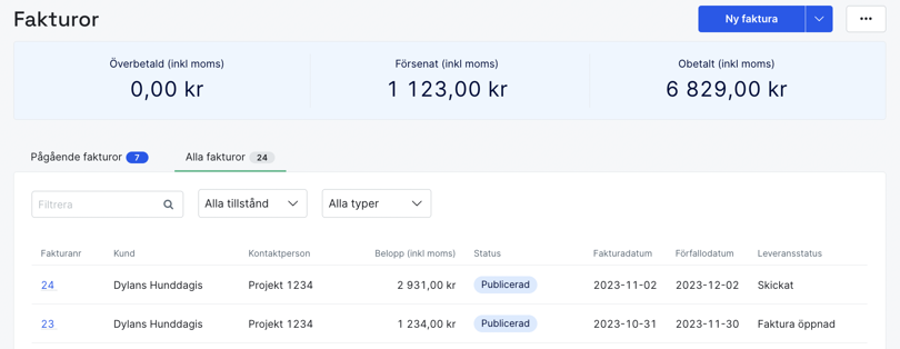 Leveransstatus för en faktura hittar du i fakturalistan eller på en enskild faktura. Statusen live-uppdateras så du direkt kan se vad som händer i realtid.