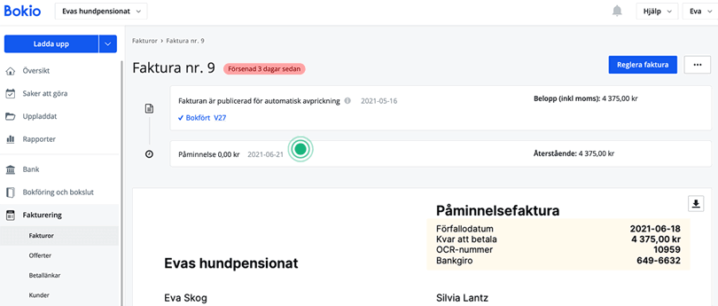 Har kunden inte betalat fakturan vid förfallodatum kan man skicka en påminnelse med eventuell avgift direkt från fakturan i Bokio. Detta kan göras tidigast dagen efter förfallodatum. Klicka på de tre prickarna "..." uppe i högra hörnet och sedan "Skicka påminnelse".