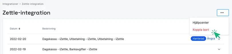 Viktigt att tänka på är att integrationen tas inte bort från Zettle-kontot. Vi kan inte längre hämta dina köp, men du behöver klicka dig in via ditt Zettle konto för att ta bort integrationen helt.