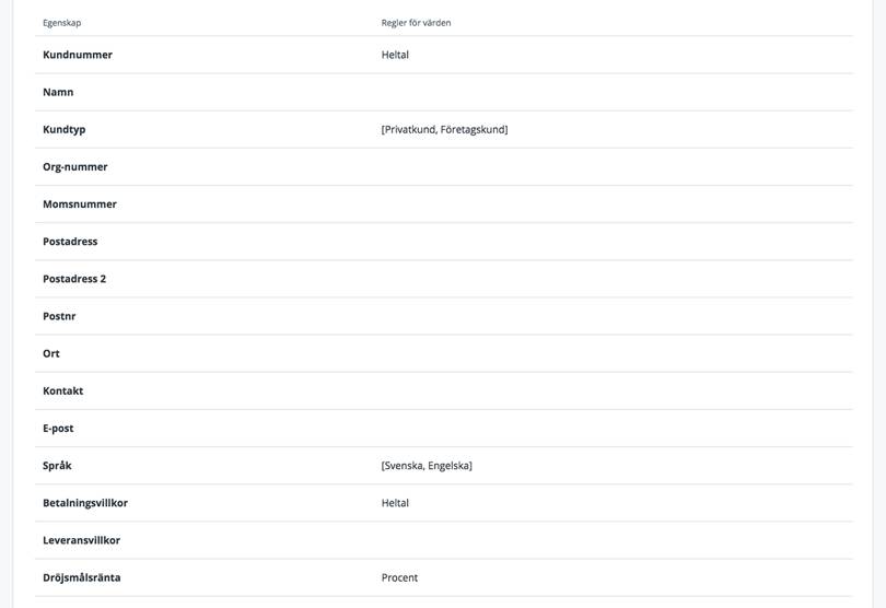 Nedanför finns en lista på vilka egenskaper för kunden som du kan importera. Det är alltså bra om det du importerar utgår från denna lista men du kommer också kunna justera detta i nästa steg.