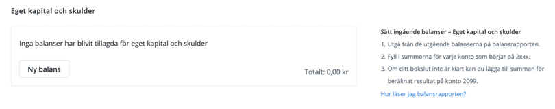 Fyll i summorna för eget kapital och skulder precis så som de visas i de utgående balanserna i balansrapporten. Börja med att klicka på knappen Ny balans i Bokio.