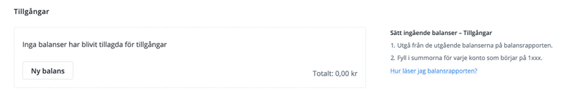 Fyll i summorna för tillgångar precis så som de visas i de utgående balanserna i balansrapporten. Börja med att klicka på knappen Ny balans i Bokio.
