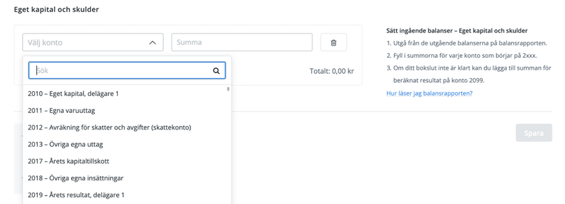 Välj sedan det konto som du vill lägga till en balans för. Fyll därefter in den aktuella summan. Upprepa dessa stegen tills alla konton för eget kapital och skulder är tillagda.