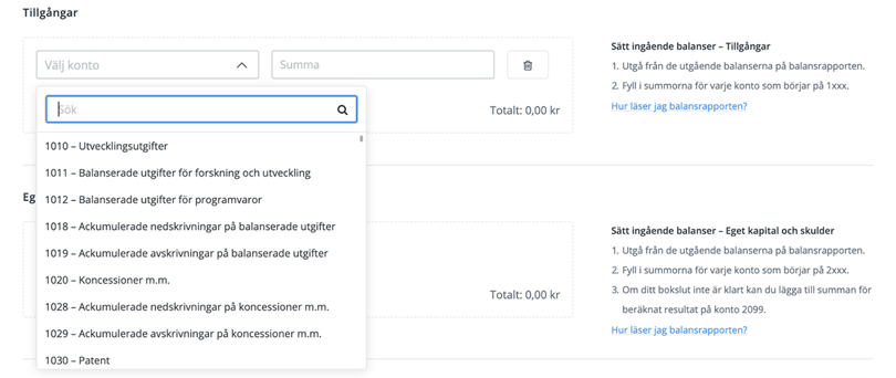 Välj sedan det konto som du vill lägga till en balans för. Fyll därefter i den aktuella summan. Upprepa stegen tills alla konton för tillgångar är tillagda och lägg därefter till alla balanser för eget kapital och skulder.