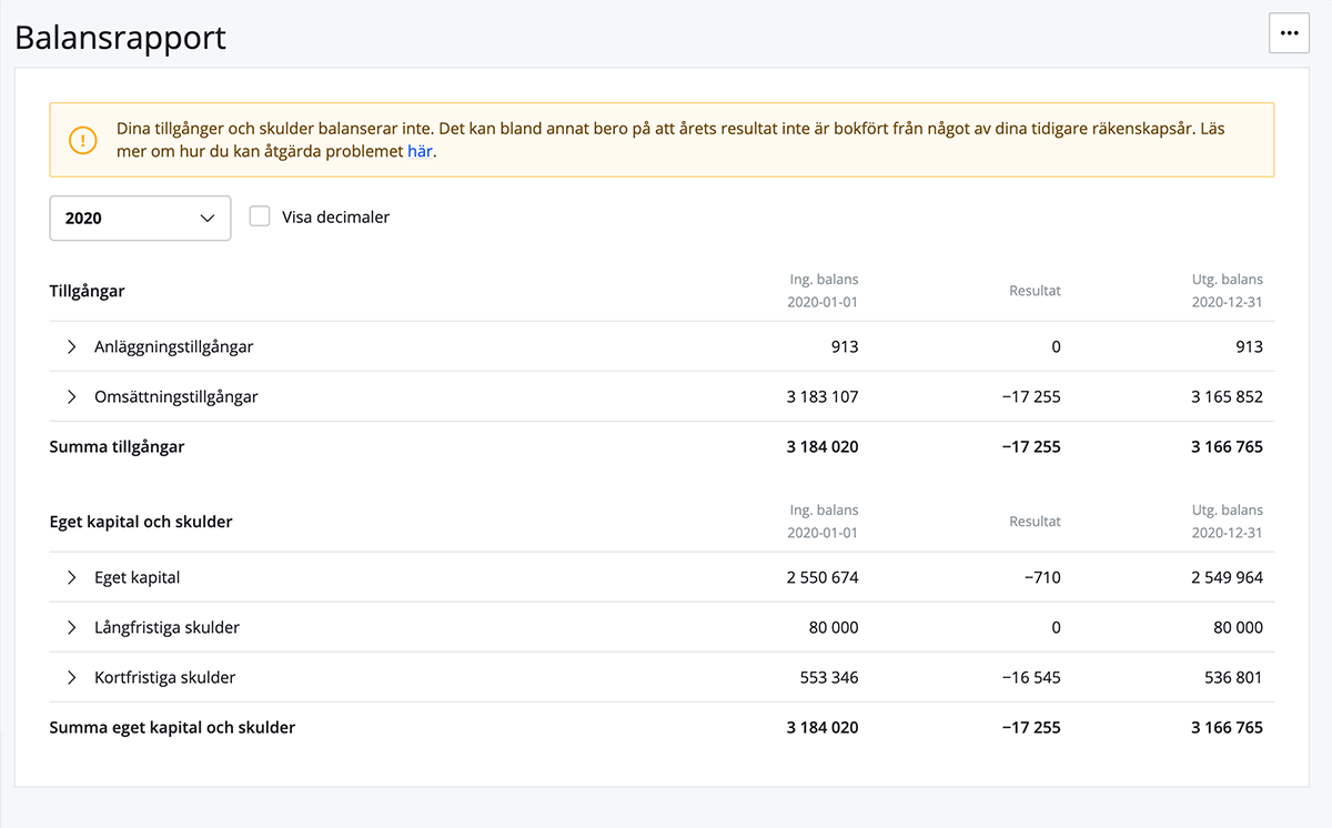 Skulle tillgångar och skulder inte balansera mellan något av tidigare räkenskapsår får du även ett meddelande om detta och hjälp med hur du går vidare för att lösa problemet.
