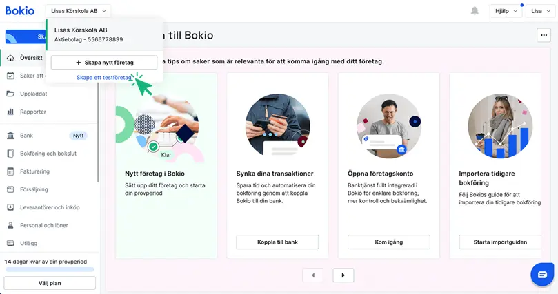 När du väljer Skapa testföretag så får du tillgång till de flesta funktionerna i Bokio men eftersom det är ett testbolag så finns det vissa begränsningar som gör att det inte går att använda för ett riktigt företag. Läs mer om testbolag här!