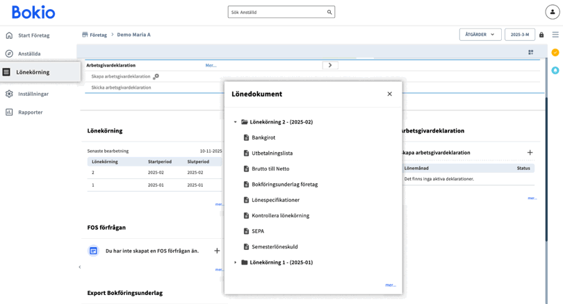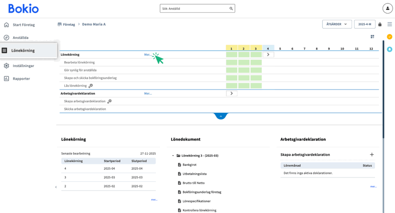 När du har färdigställt lönekörningen kommer du att kunna se resultatet under fliken Lönekörning. Där kommer du även hitta information om arbetsgivardeklaration och se över lönedokumentet.
