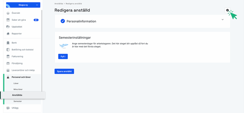 När du skapar en ny anställd, klicka på kugghjulet efter att du har fyllt i personalinformationen.