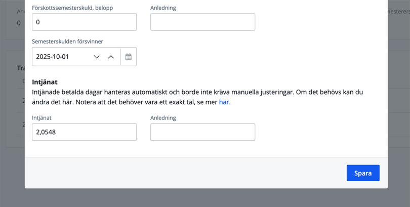 Om du behöver ändra summan intjänade dagar kan du göra det här.