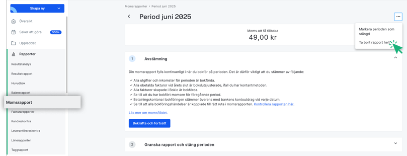 Du har alltid möjlighet att låsa upp en momsperiod om du behöver göra justeringar i din bokföring. Samtliga steg, 5-1, behöver låsas upp för att dina ändringar ska tas med i rapporten. Du behöver också "Ta bort rapport helt".