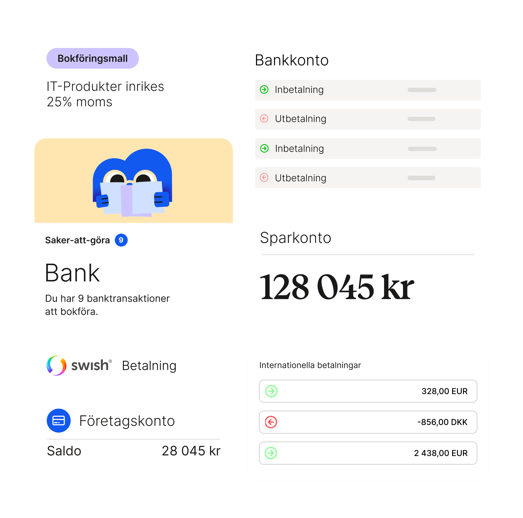 Med Bokio Företagskonto får du ett bankkonto, bankgironummer och företagskort direkt i Bokio. Du kan då hantera alla typer av in- och utbetalningar från Bokio, utan att gå omvägen via en extern bank.