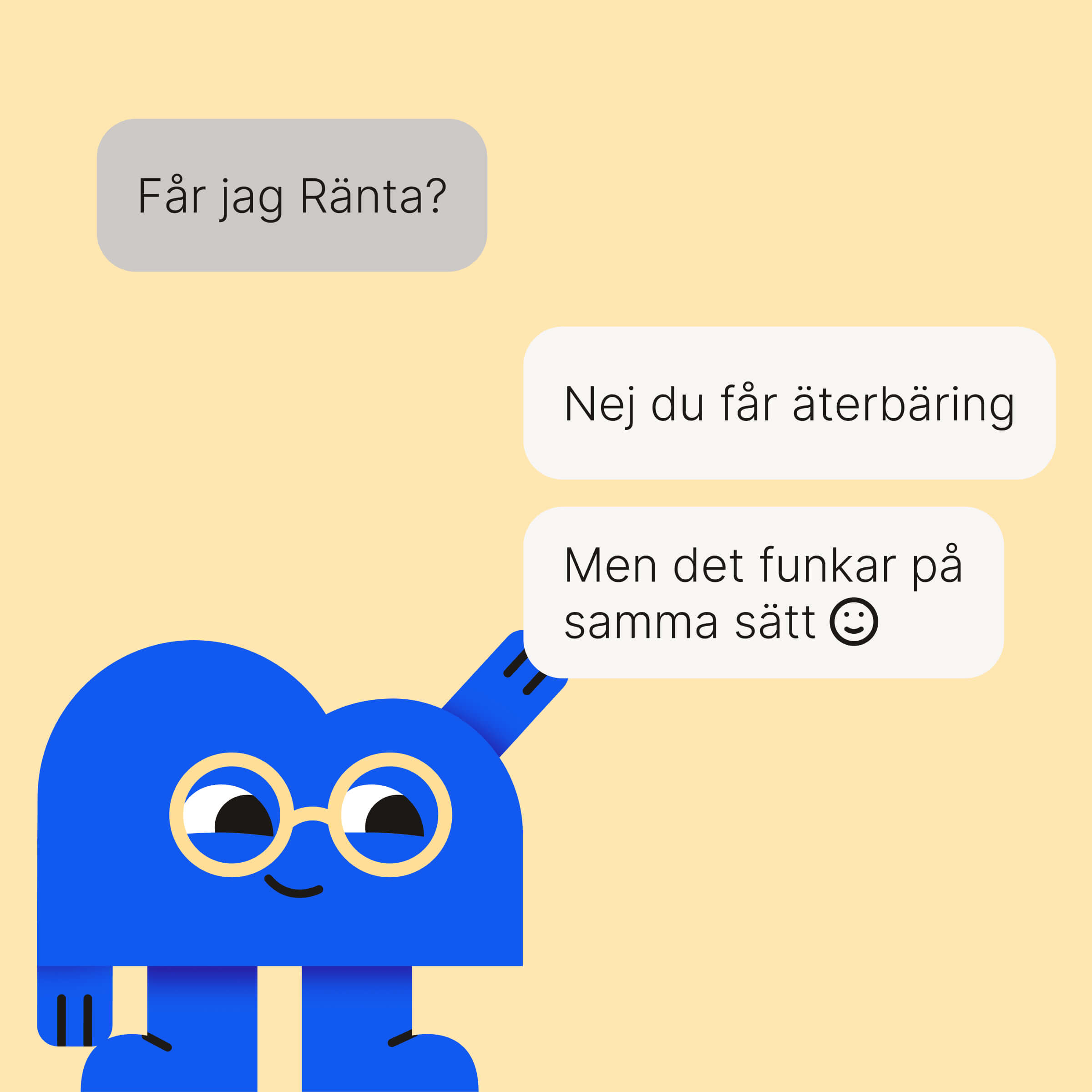 Vår återbäring fungerar på samma sätt som ränta. Men till skillnad från de flesta banker får du utbetalning varje månad, fria uttag, ingen beloppsgräns eller bindningstid.